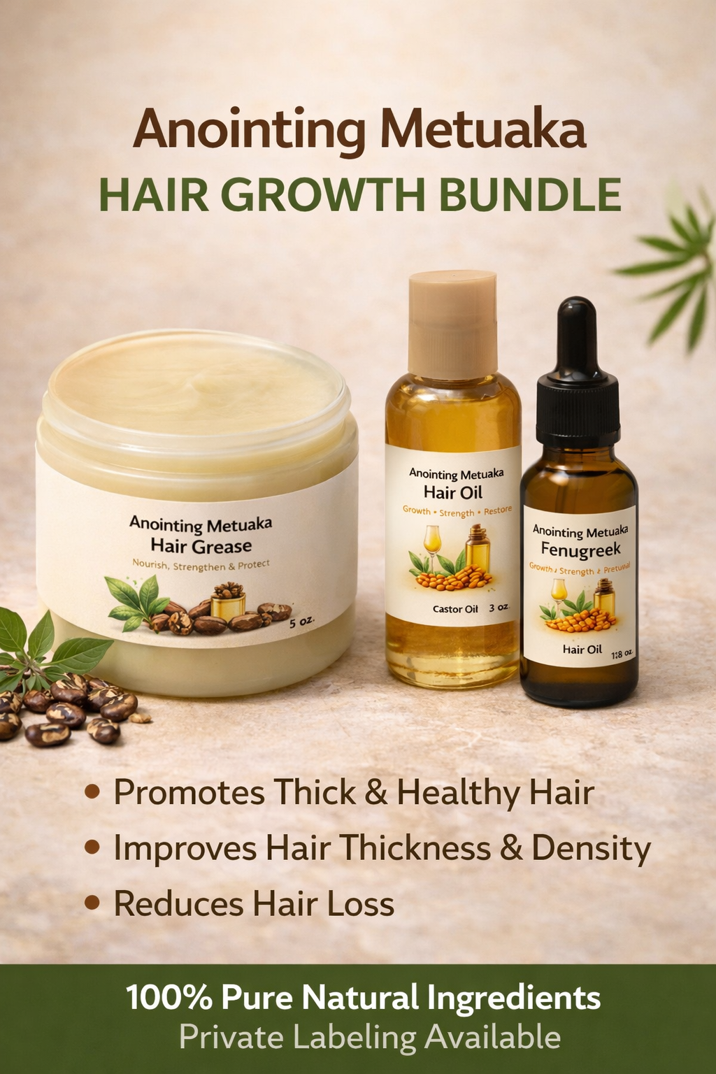 The Anointing Metuaka Hair Growth Bundle is a powerful three-step nourishment system designed to restore, strengthen, and support thicker, healthier-looking hair. Carefully formulated with fenugreek, basil, castor oil, and other nutrient-rich botanicals, this bundle targets the scalp and strands to promote long-term hair vitality.