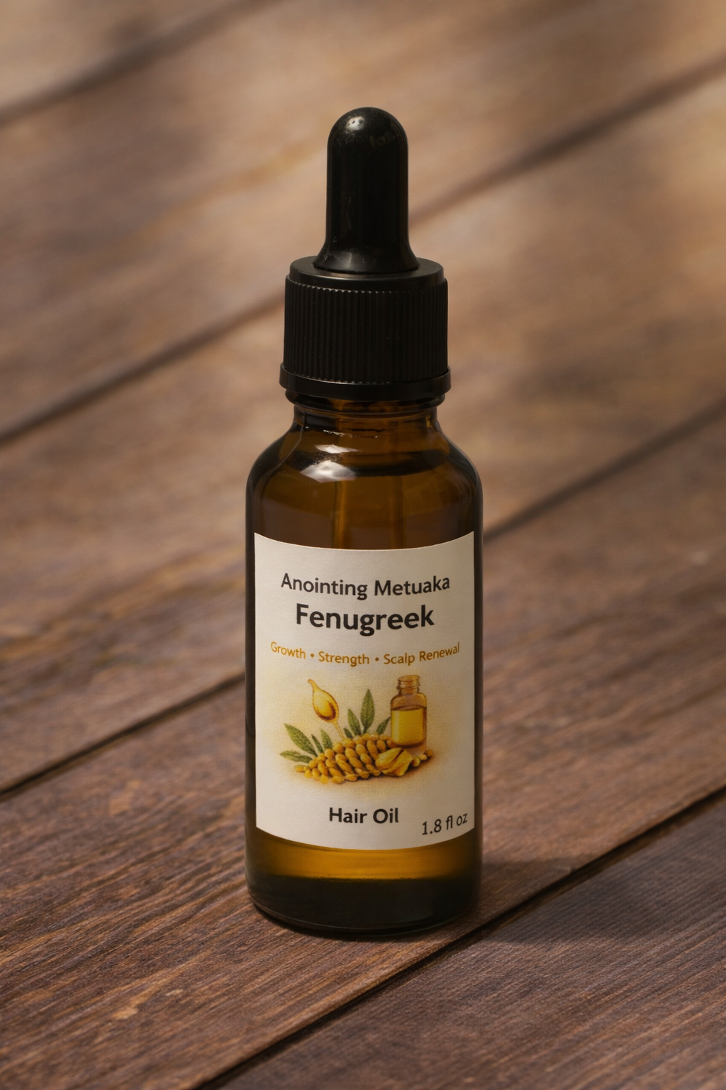 Anointing Metuaka Fenugreek Hair Oil is a deeply nourishing yet lightweight treatment designed to support stronger, fuller-looking hair from root to tip. Crafted with a powerful infusion of botanical oils and herbal extracts, this blend works to revitalize the scalp, reduce breakage, and promote healthy hair growth without weighing your hair down.